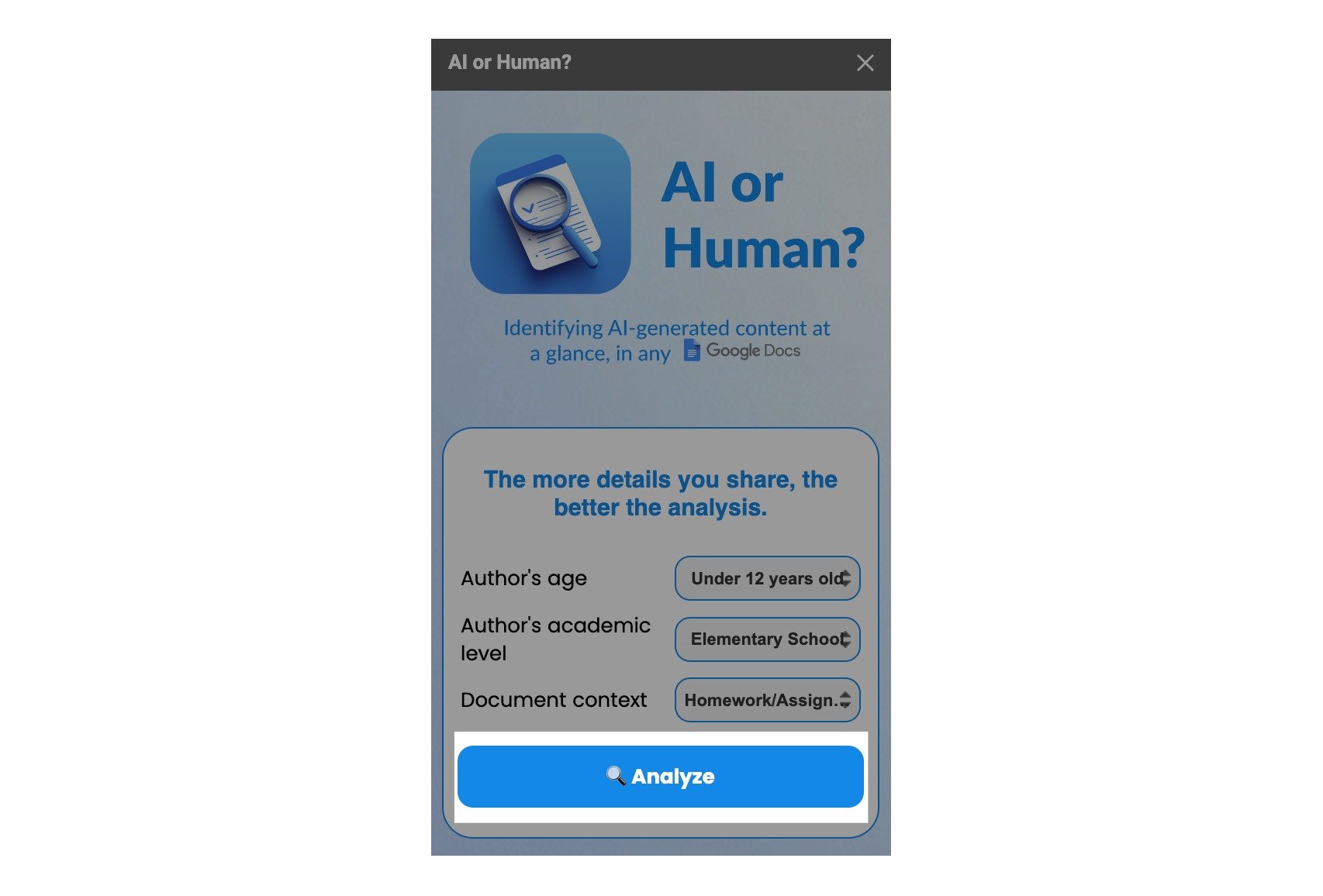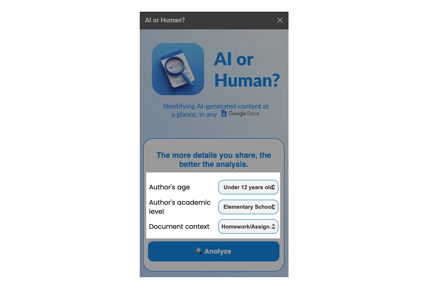 Search "AI or Human" in the Google Workspace Marketplace and install it